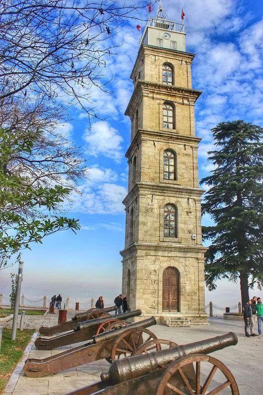 Osmanlı Sultanı II. Əbdülhəmidin taxta çıxmasının 29-cu ildönümü şərəfinə tikildiyi deyilən Tophane Saat Qülləsi Tophane parkında yerləşir. 6 mərtəbəli və 33 metr uzunluğunda olan Tophane Saat Qülləsi Bursada Osmanlı dövrü memarlığını əks etdirən mühüm tarixi abidə kimi görünür. Bursaya səfəriniz zamanı tarixi saat qülləsini ziyarət edərək Bursanın panoramik mənzərəsini də görə bilərsiniz.
